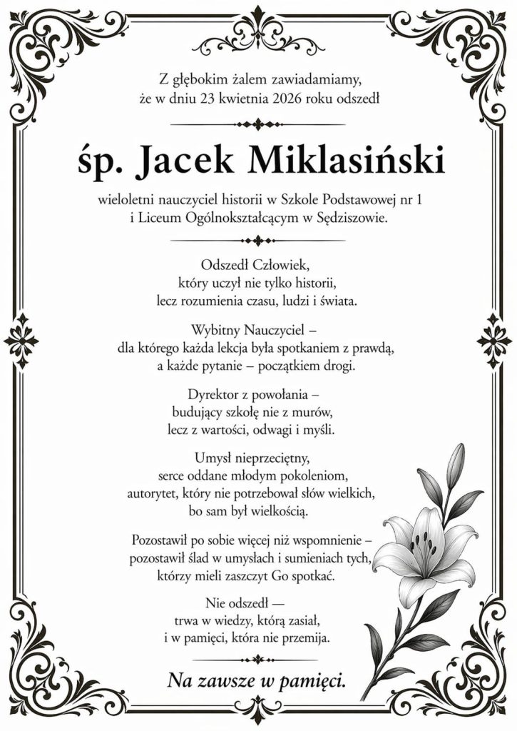 Z głębokim żalem zawiadamiamy, że w dniu 23 kwietnia odszedł śp. Jacek Miklasiński wieloletni nauczyciel historii w Szkole Podstawowej nr 1 i Liceum Ogólnokształcącym w Sędziszowie